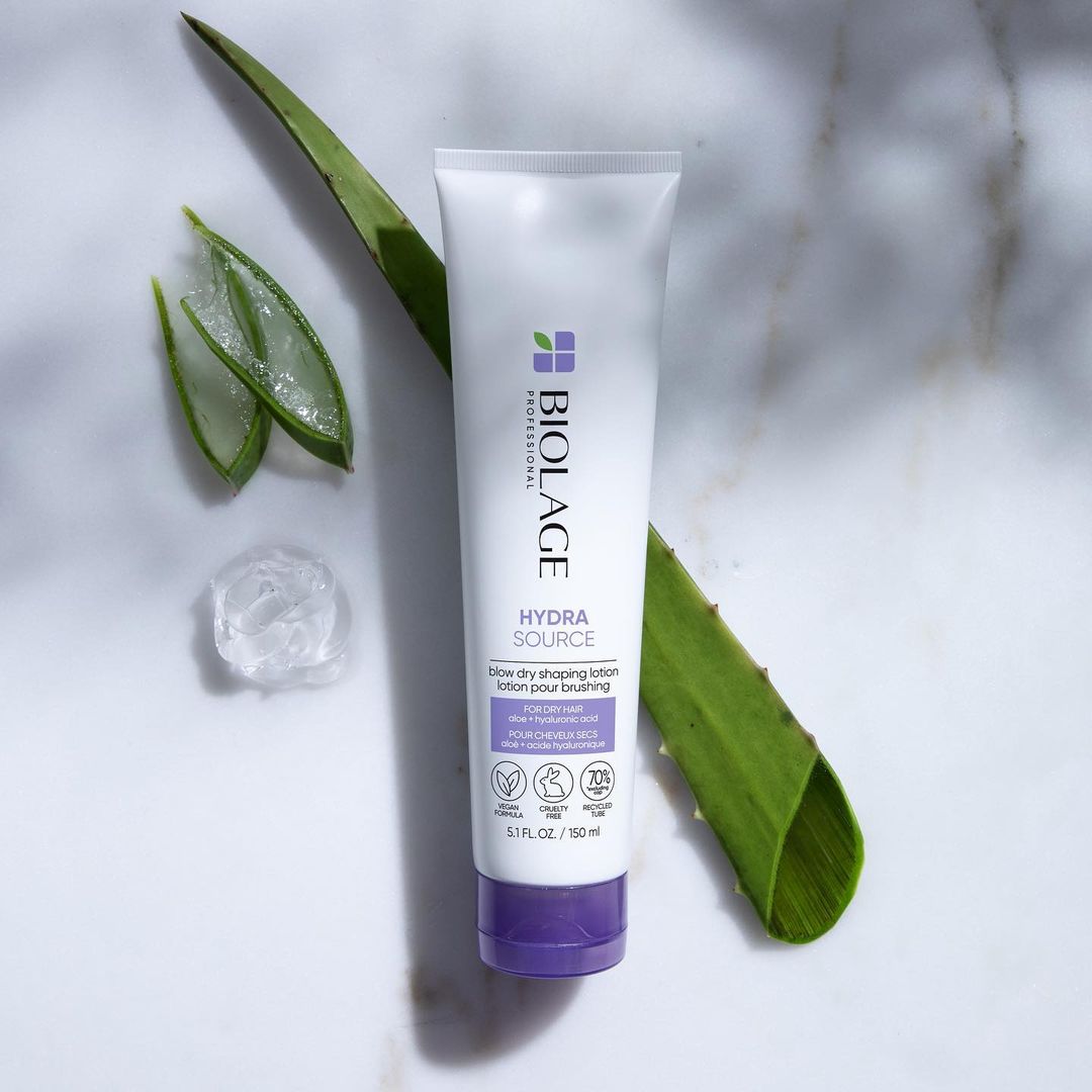 Лосьон Hydra Source от Biolage. Невесомая текстура и гармоничное сочетание двух активных увлажняющих компонентов: гиалуроновой кислоты и экстракта алоэ. Лосьон усиливает естественную текстуру волос, обеспечивает легкую фиксацию в качестве праймера укладки.