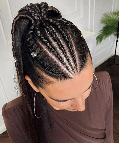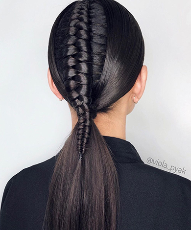 По мнению стилистов, объемные плетения эффектнее выглядят на черных волосах с мелированием — достаточно добавить светлые блики на несколько прядей. Без хайлайтов прическа кажется монолитной, плоской. Скульптурные косички и тонкие французские плетения разбивают впечатление черного монолита, их брюнетки носят и в повседневных образах, и по особому случаю.