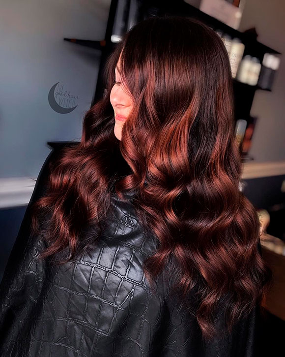 Вишневую колу носят на длинных волосах с плавной растяжкой цвета или на лаконичных стрижках в однотонном окрашивании. Оттенок достаточно темный, чтобы обойтись без осветления.
