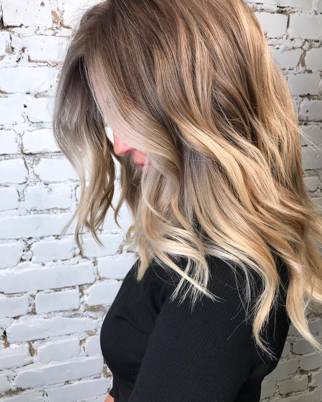 Мультитехники с растяжкой цвета выбирают блондинки и обладательницы русых волос. Цвет затрагивает прикорневую зону, что не мешает прядям красиво отрастать.