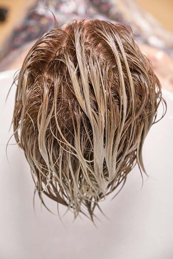 - Мастер проводит диагностику волос клиента и выбирает продукт для удаления цвета окрашивания.