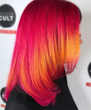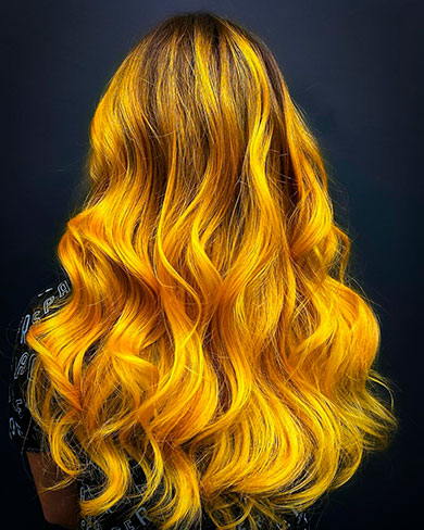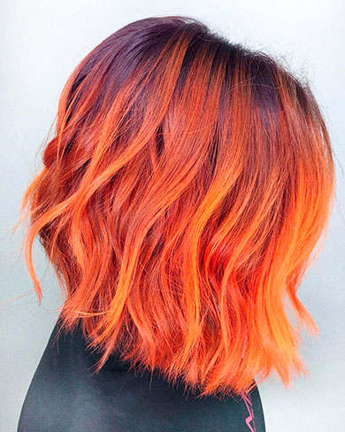 - Огненные волосы становятся похожими на пламя с молочными, золотистыми, оранжевыми и красными бликами в техниках колорирования.