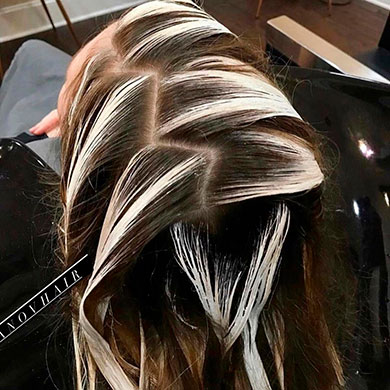 - Осветление. Стилист проводит диагностику волос, подбирает технические продукты и делит пряди на зоны с учетом колористического рисунка. После нанесения состава мастер контролирует процесс осветления. В некоторых техниках мелирования используется фольга, открытые техники проходят без фольгирования.