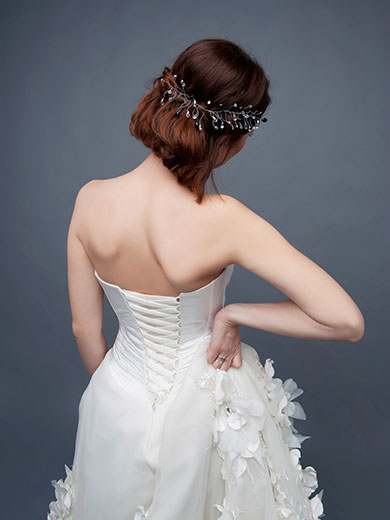 В текстурной укладке с очерченными локонами достаточно одного аксессуара: цветка, авторской заколки, декоративной шпильки. С гладкими и естественными прическами допустимы вольности. Результат зависит от того, насколько далеко простираются границы фантазии стилиста и какие детали должны стать акцентными — прическа, наряд или что-то другое.