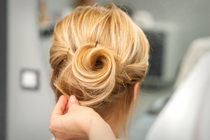 Запустите в основание пучка несколько невидимок. Самый подходящий момент убрать в укладку выпадающие пряди. На каждую невидимку распылите спрей экстрасильной фиксации — крепление будет более уверенным.