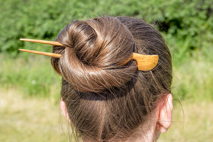 Хороший вариант для длинных и плотных волос. Прежде всего соберите волосы в хвост и завяжите их обычной резинкой. Затем возьмите палочку для пучка и вставьте ее под основание движением снизу вверх. Если под рукой только палочки для еды, перекрестите их для надежной фиксации — и ваш пучок останется с вами на весь день.