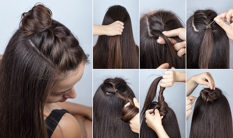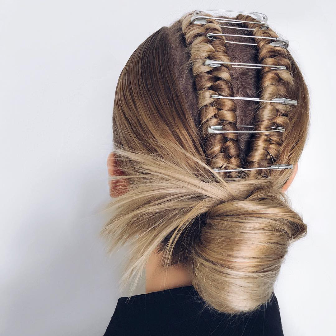 - Получившийся хвост сверните в пучок, зафиксируйте на голове невидимками. Тут как раз пригодится декоративная шпилька как финальный штрих образа.