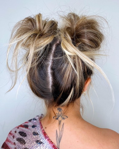 Эту укладку с двумя милыми пучками еще называют азиатской. Ее часто носят девушки-айдолы из корейских поп-групп. Она придает образу наивный кукольный флер, красиво открывает лицо и шею.