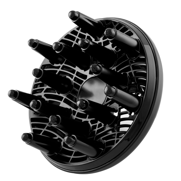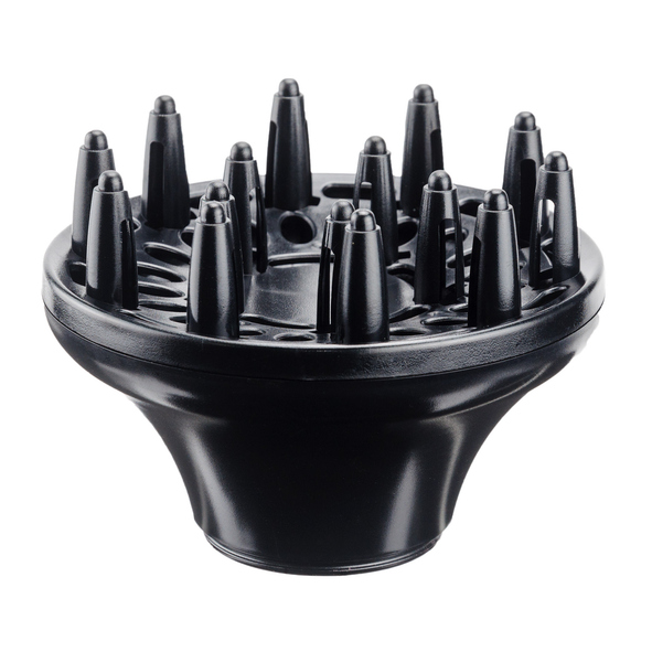 Диффузор у фена представляет собой широкую насадку, обычно съемную. Выглядит этот аксессуар специфически: как тарелка (или глубокая чаша) с прямыми или спиральными зубцами — назовем их «пальчиками». Они разделяют пряди и не позволяют снова спутываться при сушке.