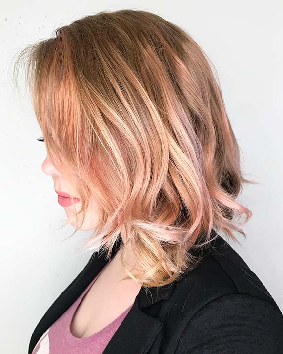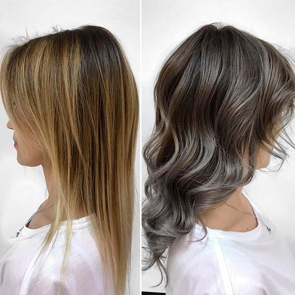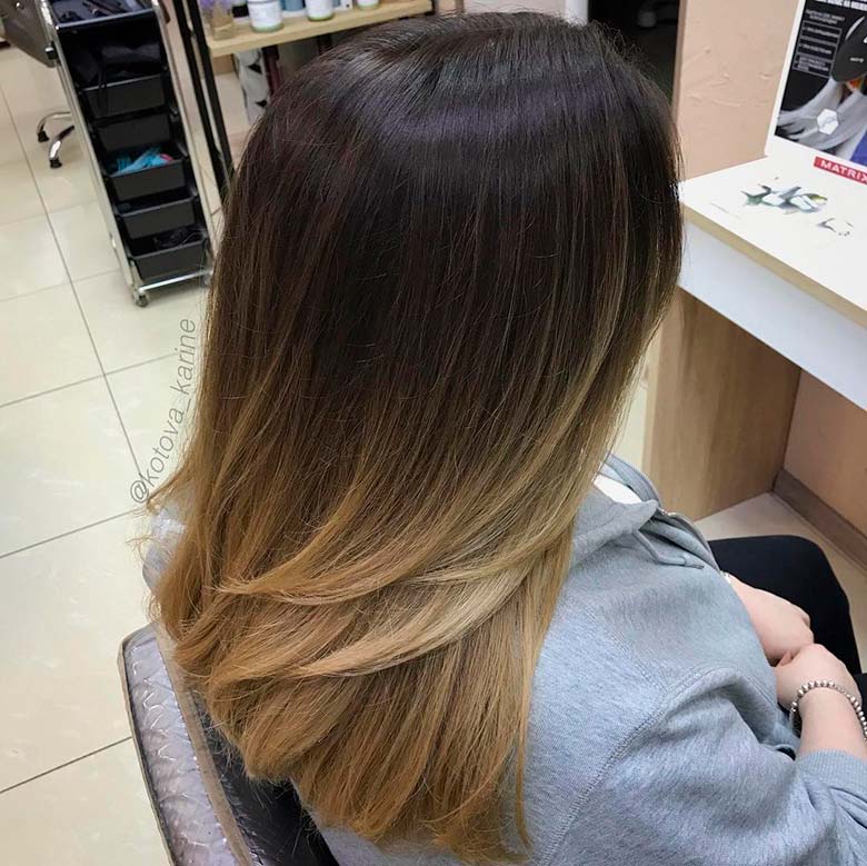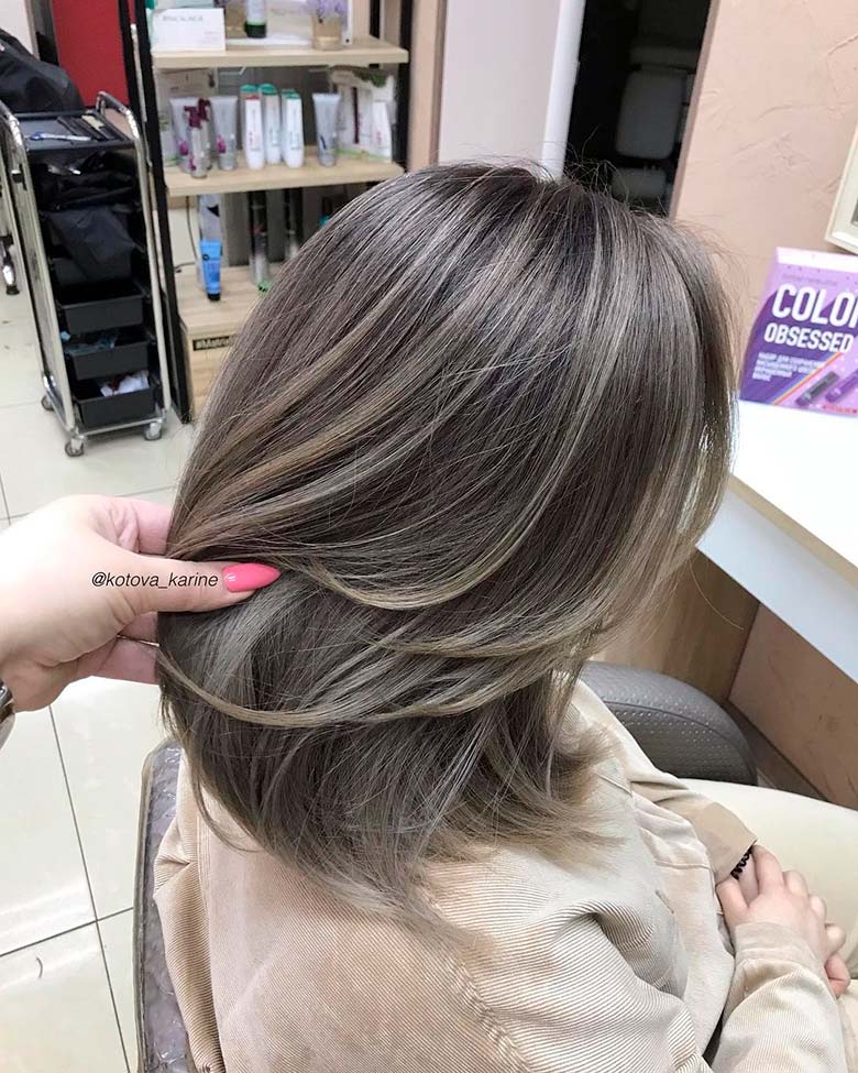Сложное окрашивание в приглушенной палитре удачно подчеркнет текстурную форму градуированного каскада на средних волосах, фото ниже иллюстрируют эту особенность мелирования с растяжкой цвета.
