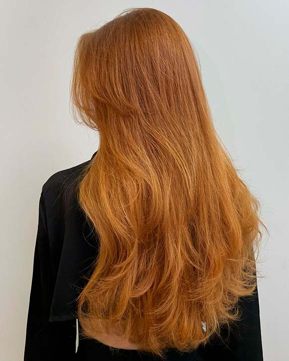 Стилисты видят длинный градуированный каскад обязательно с челкой: шторкой, удлиненной косой или невесомой корейской. Пряди пышно спадают на лоб и незаметно исчезают в общей массе волос по бокам.